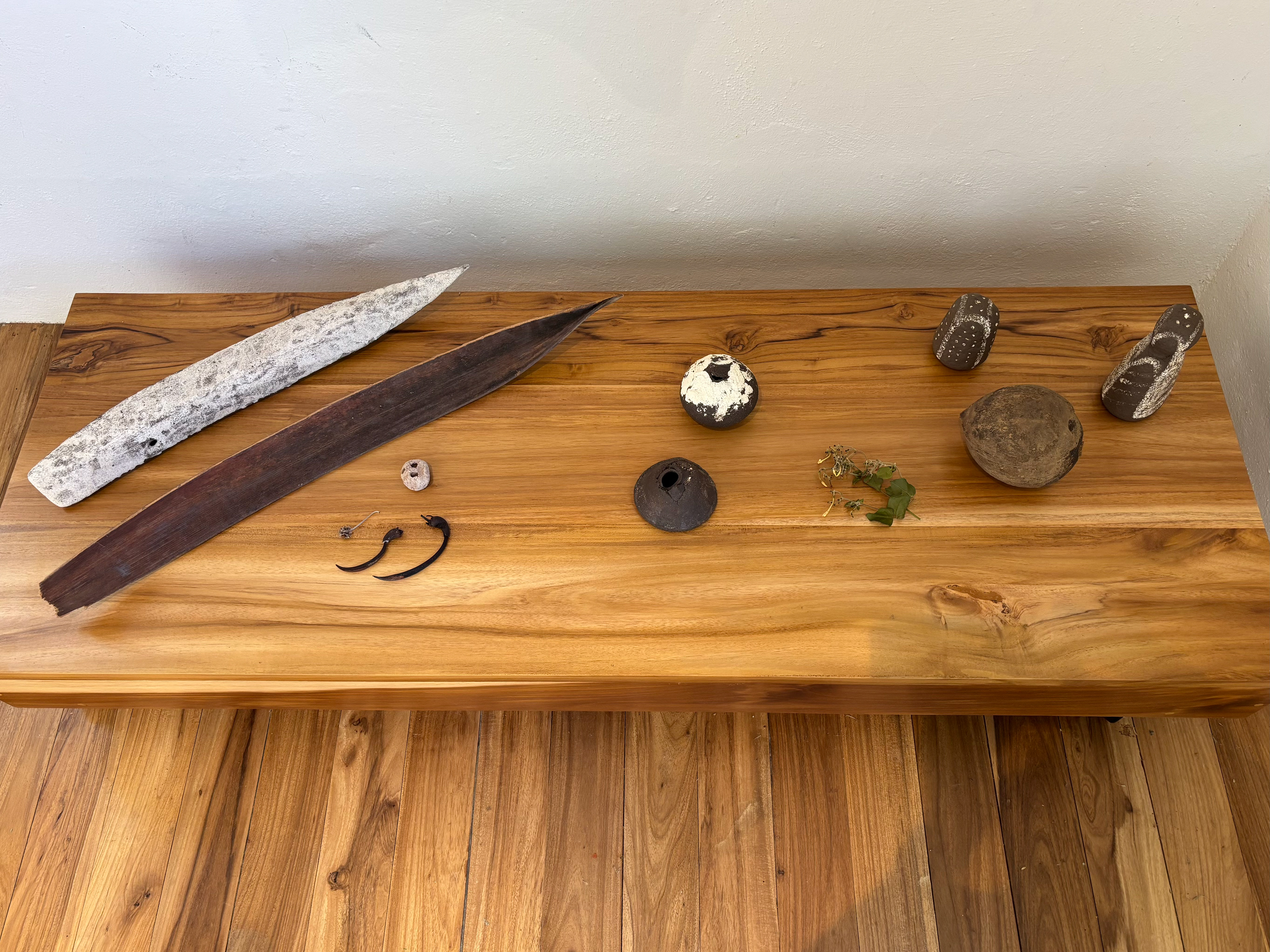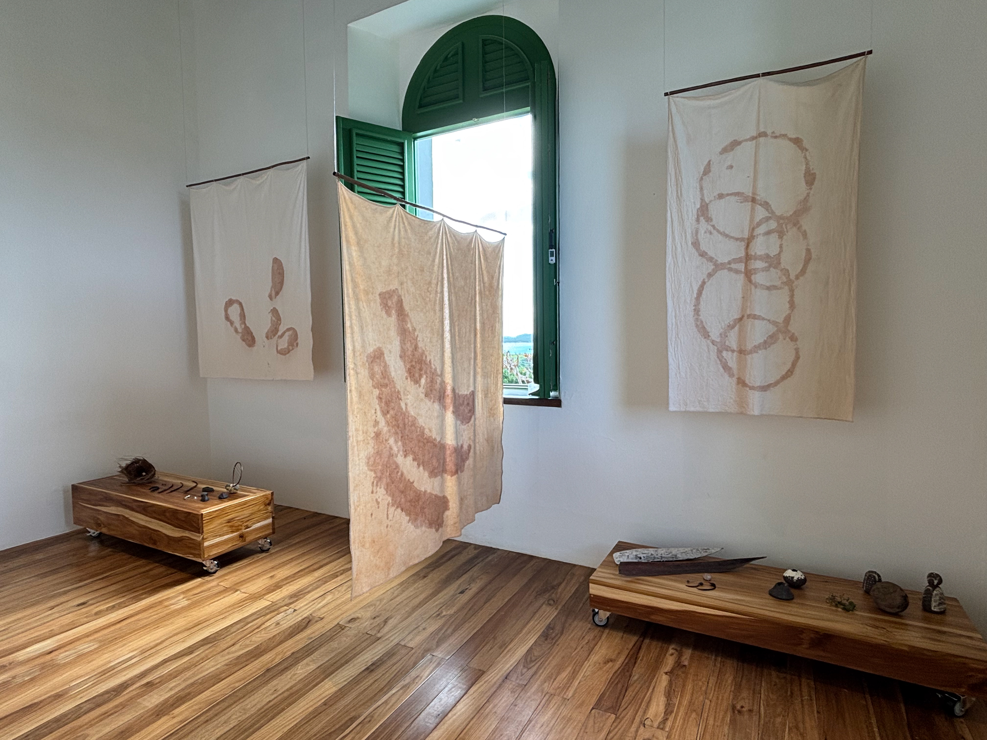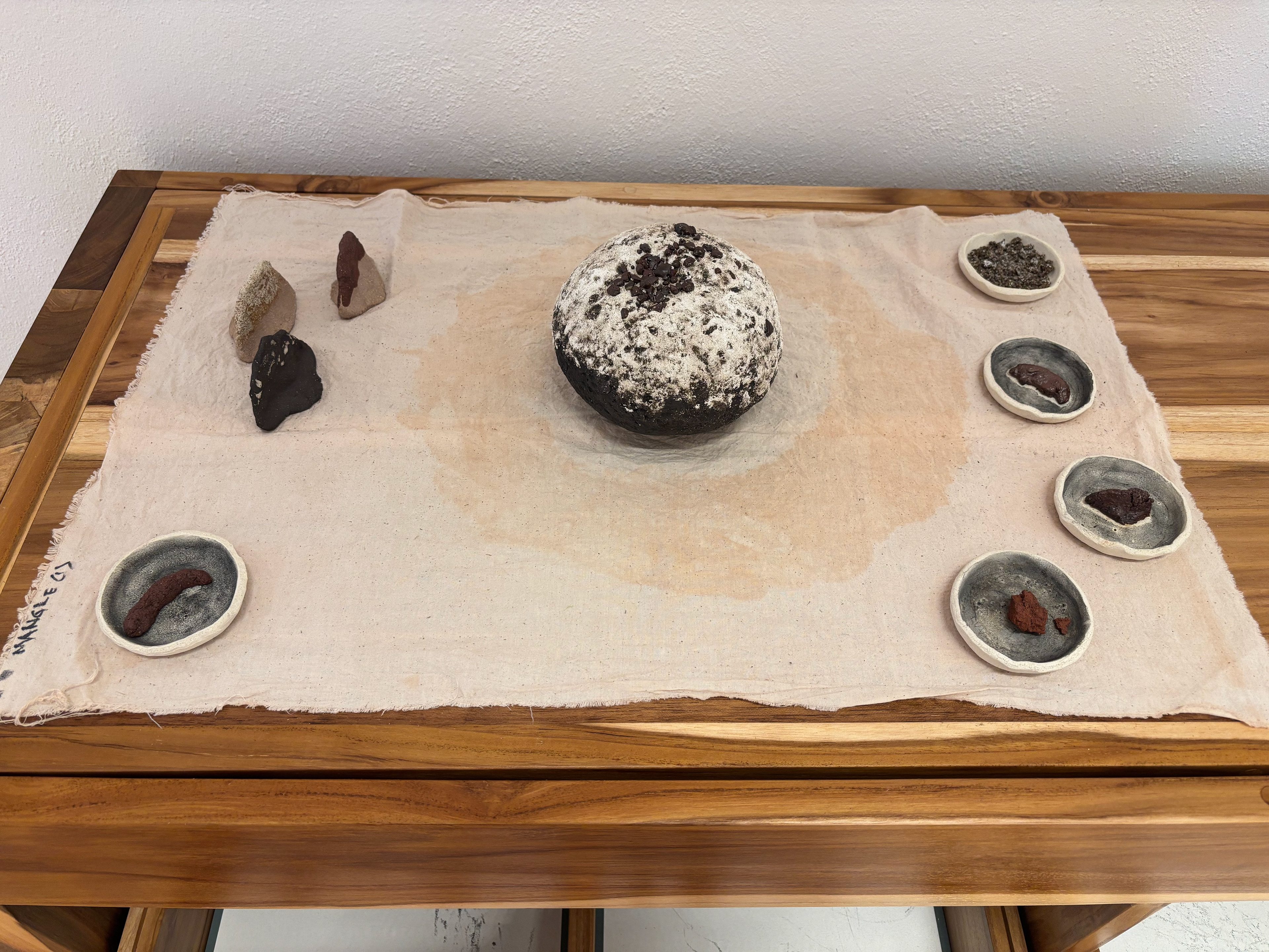 Stoneware, wild clay, local minerals, coconut palm fronds and fabric, Rhizophora mangle (red mangrove) roots, silver, drawings (paper and charcoal). Variable dimensions.