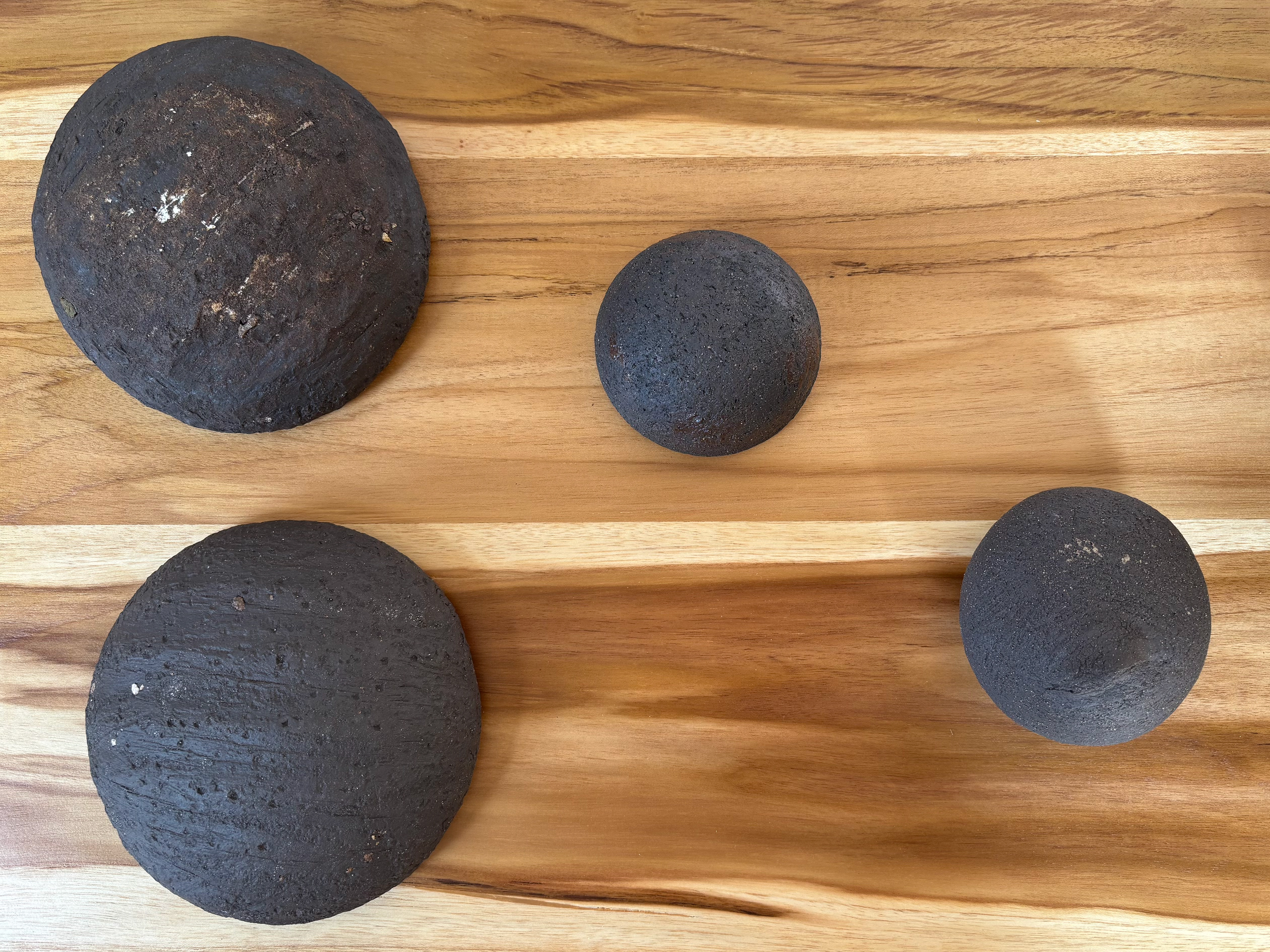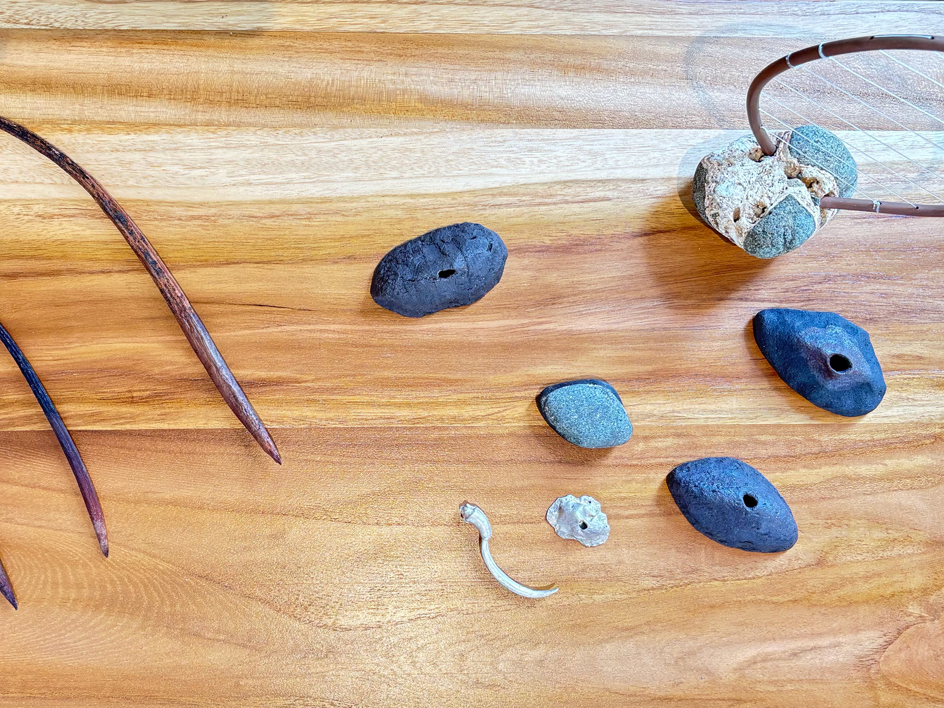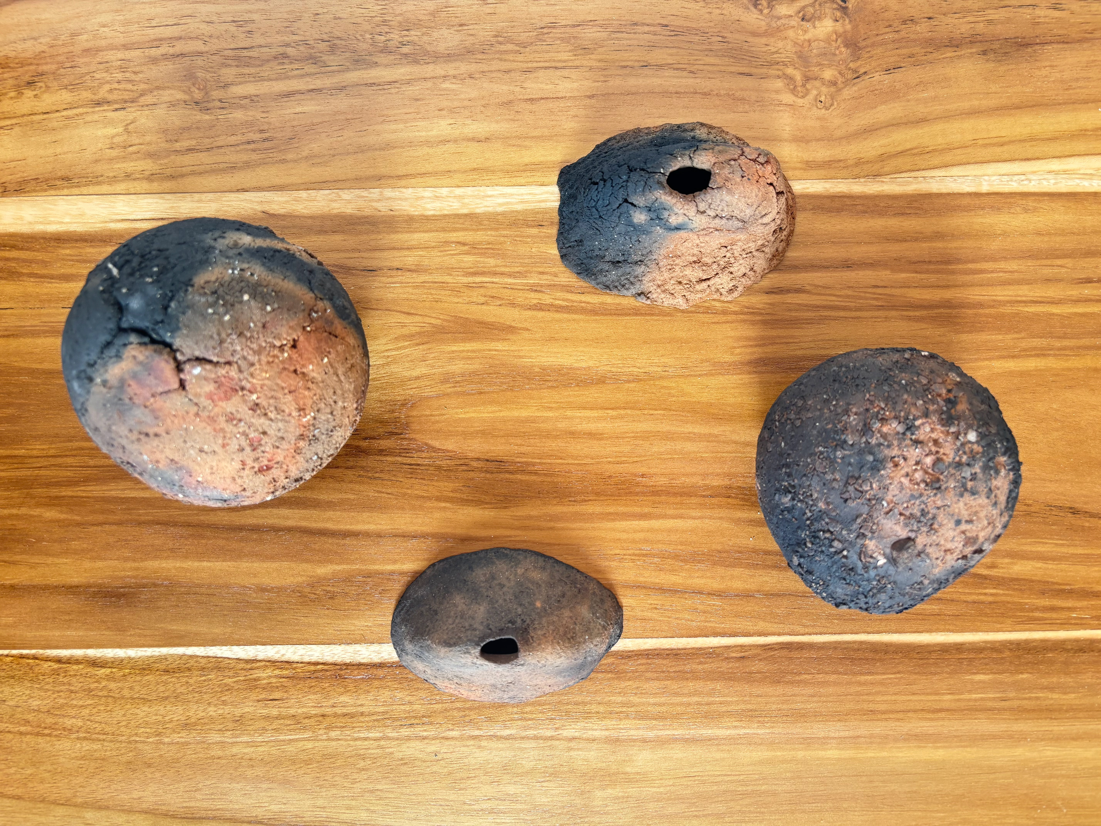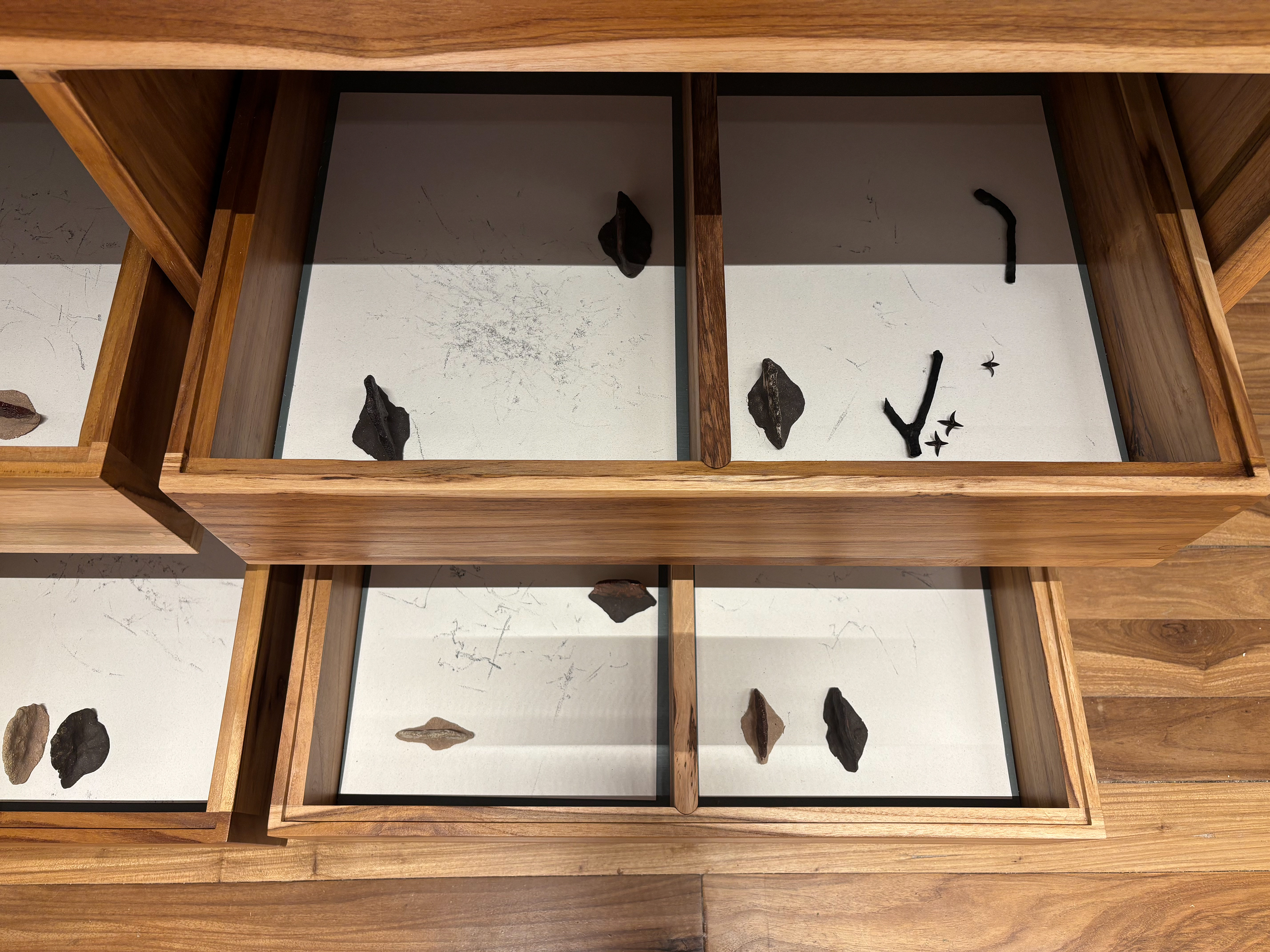 Stoneware, wild clay, local minerals, coconut palm fronds and fabric, Rhizophora mangle (red mangrove) roots, silver, drawings (paper and charcoal). Variable dimensions.