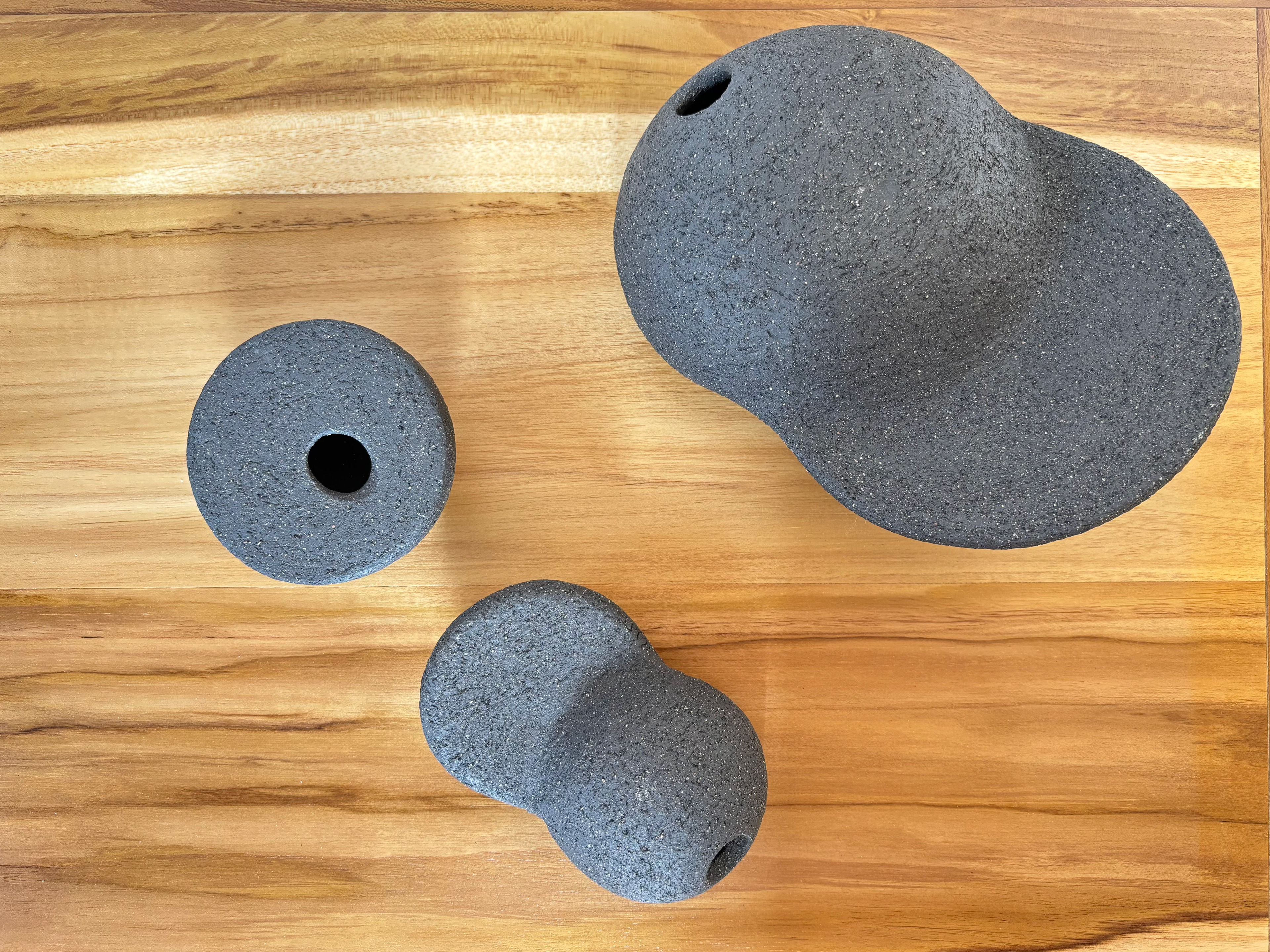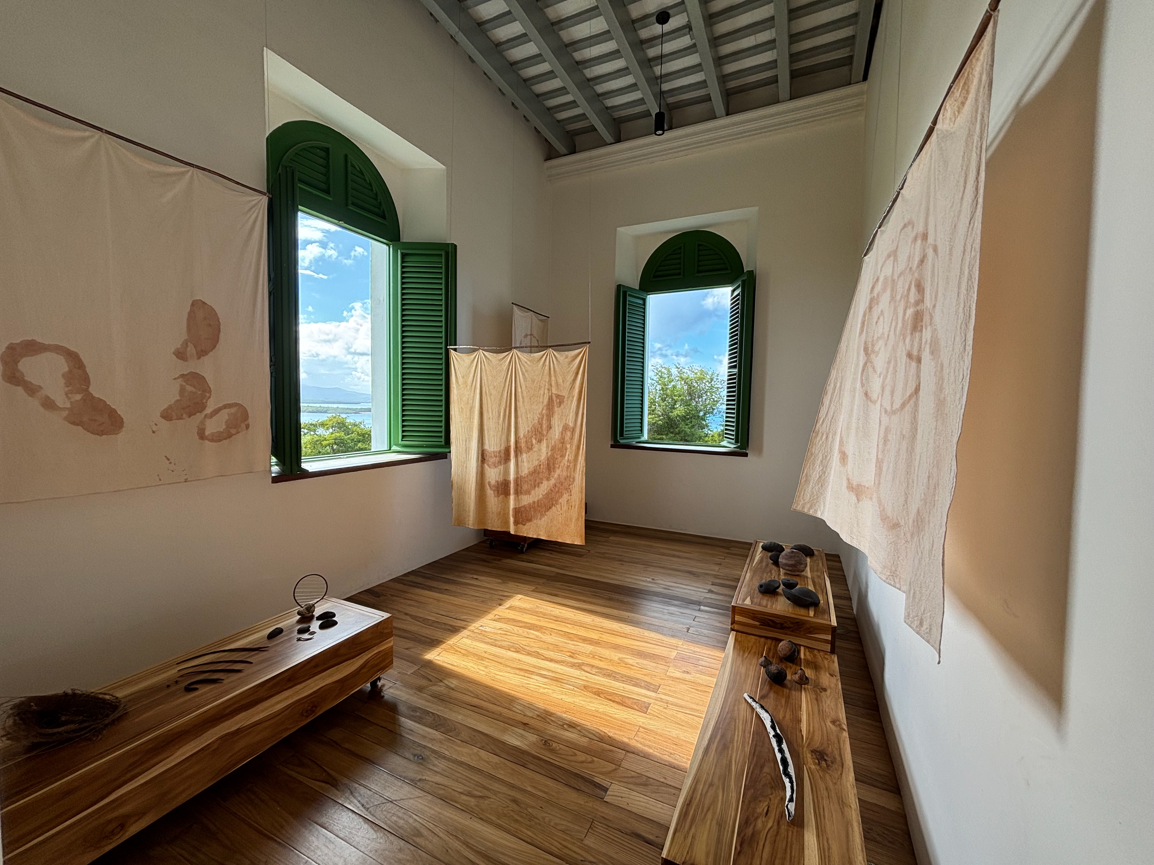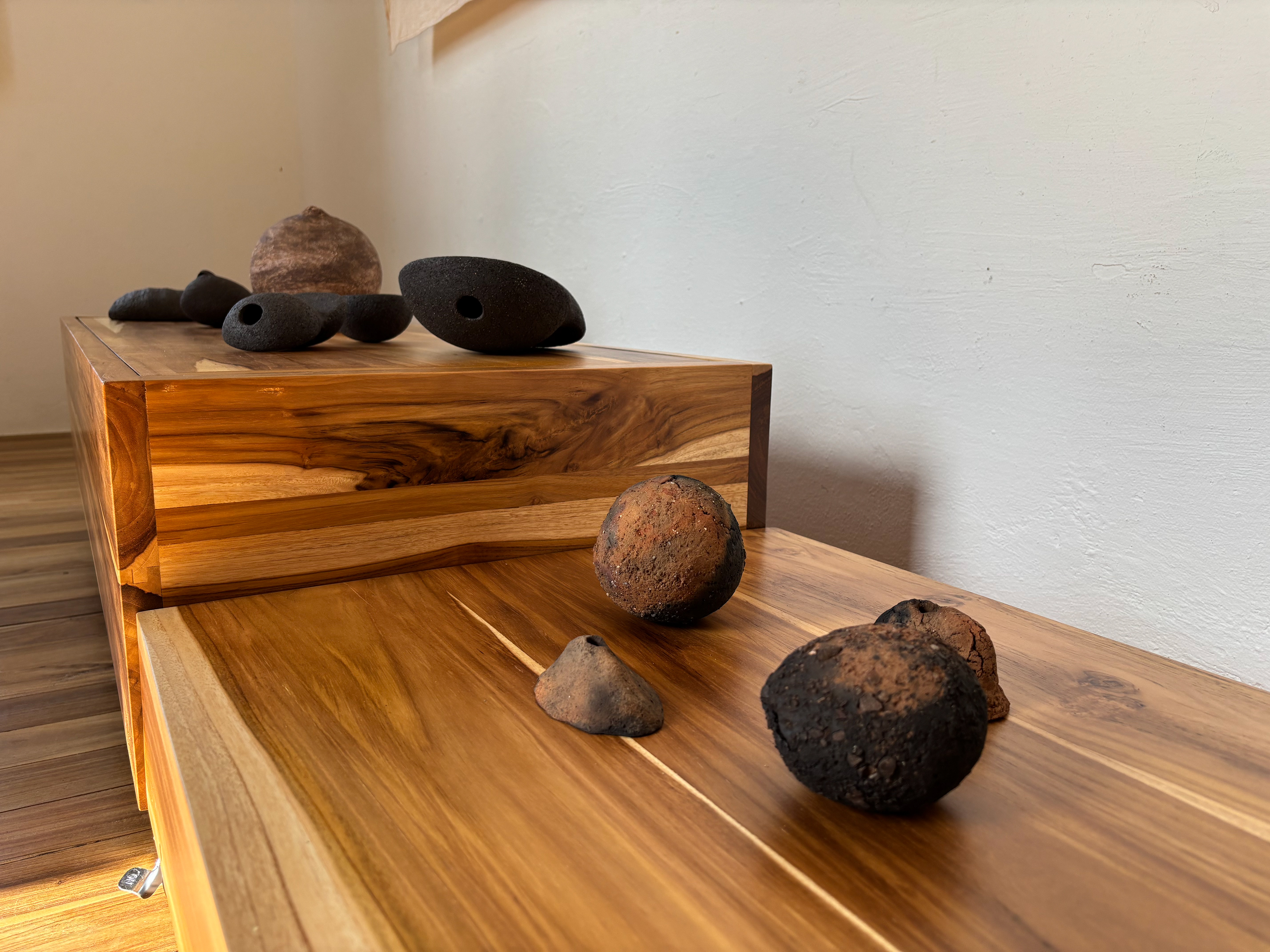 The series of objects, mostly ceramic, function as instruments; they don't exist to be seen merely, but to be activated and invite us to a sensory experience. They are meant to be struck, or to be moved like the ebb and flow of the wind, to be held carefully in the hands and brought close to our ears as when we hold a seashell: in these ceramics vibrate the murmur of the sea and the sediments of time, now offered to you as a gift. The objects were molded using various soils from this archipelago (some from the Fajardo region itself) and together offer a sampler of the soils that nourish and sustain life." (Mauricio Marcin, Curator)