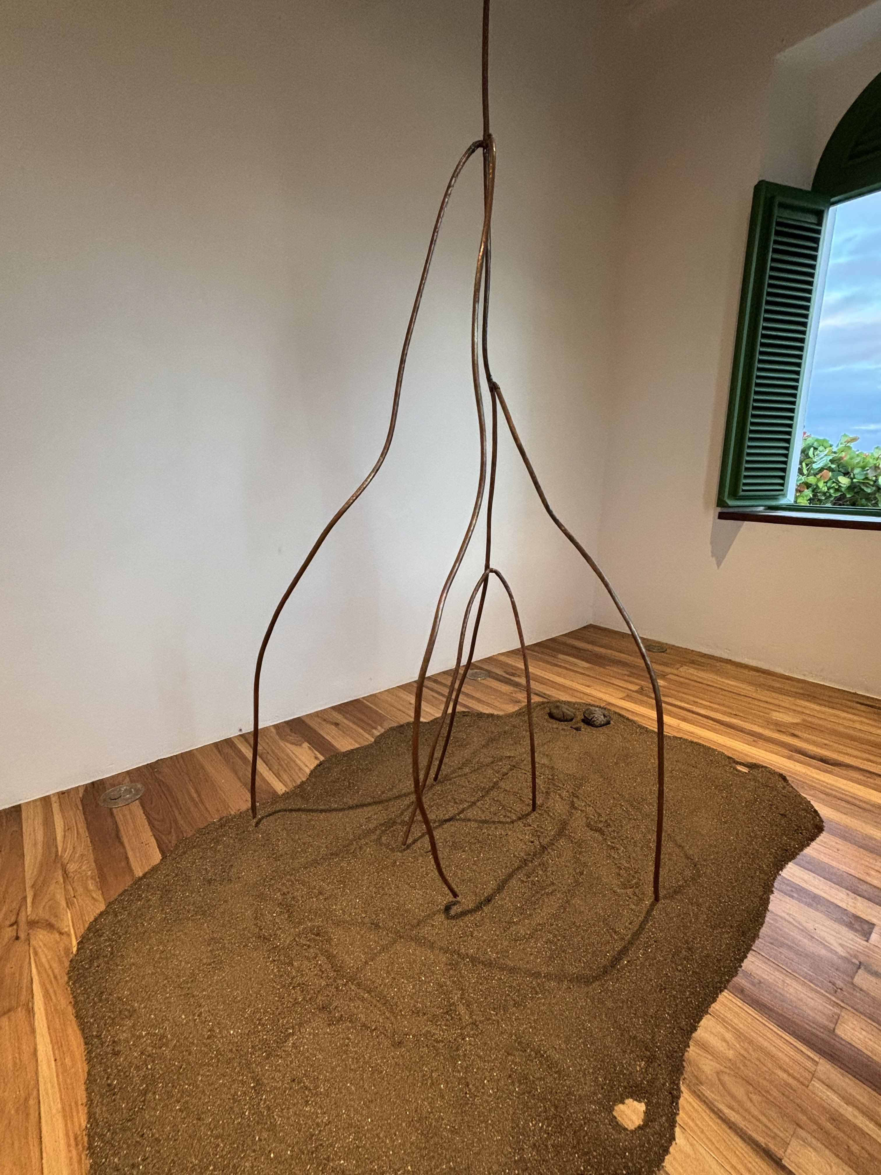 The mimicry of the mangrove moves with the trade winds that enter the building and draws on the earth collected in the region: an ephemeral, constantly changing trace created in a close relationship between the wind, the sculpture, and the earth.